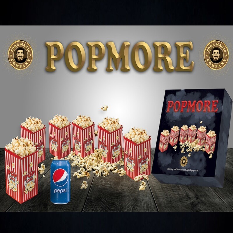 Pop More – Tora Magic: En virkelig flot effekt til dine børne- og familieshows. Du viser to firkantede hylstre. Indeni det ene er der en dåse sodavand, og i det andet en beholder med popcorn. I denne sjove rutine skifter dåsen og beholderen med popcorn på magisk vis hele tiden fra sted til sted. Effekten svarer til det kendte trick “Multiplying Bottles”. Som et fantastisk klimaks bliver beholderen med popcorn til 2, så til 3, så til 4… indtil der til sidst er hele seks 6 beholdere med popcorn!… Og dåsen vil være fuldstændig forsvundet. En sjov og magisk “fest” for øjet!